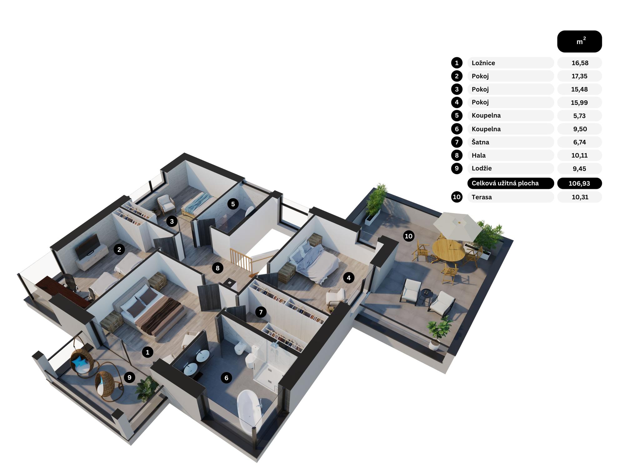 • Hlavní ložnice s privátním lodžií a šatnou, samostatná koupelna