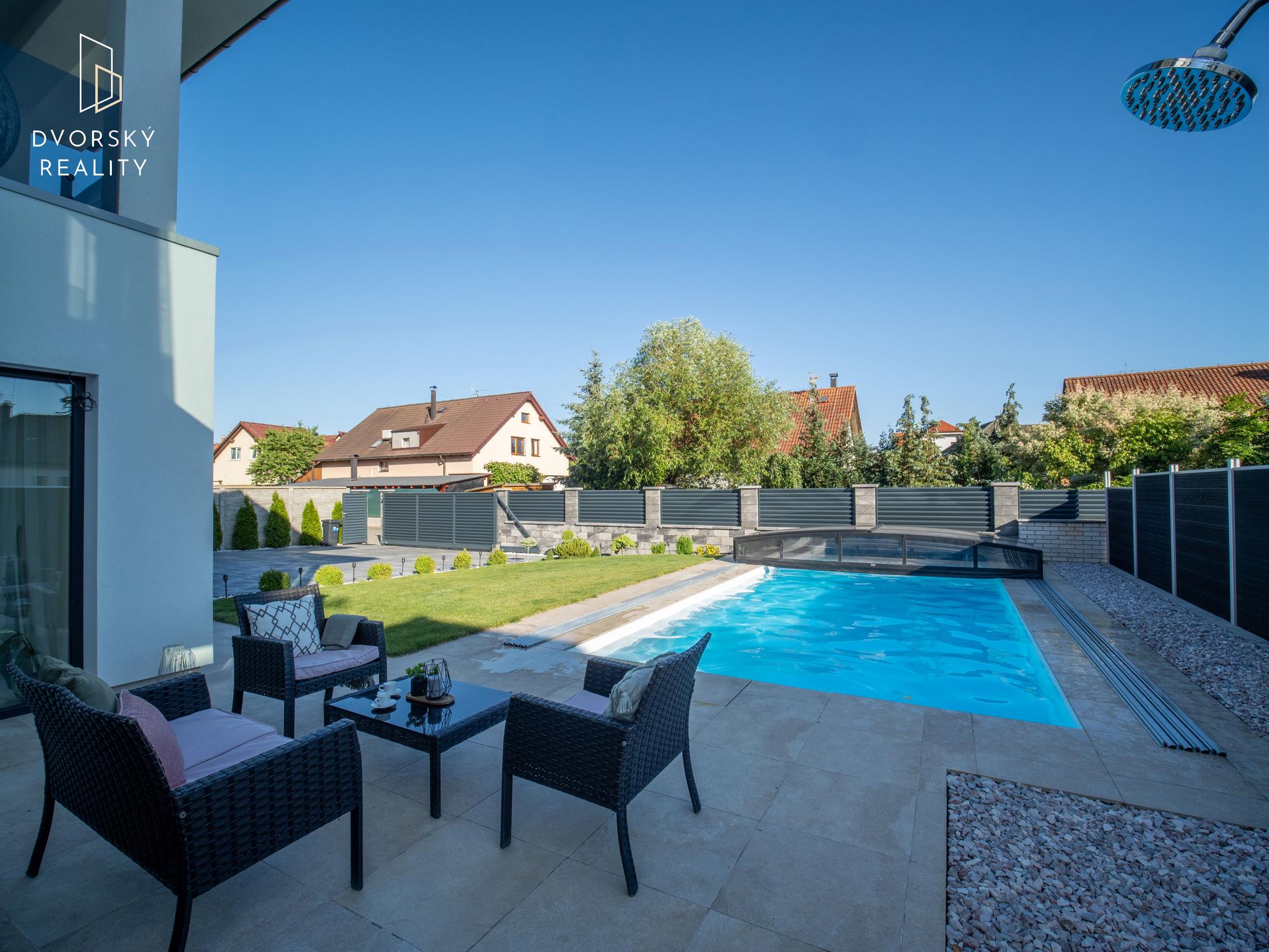 Exkluzivně nabízíme ke koupi nadstandardní rodinnou vilu o dispozici 6+1 a užitné ploše 243 m², situovanou v klidné rezidenční zástavbě v oblíbené lokalitě Květnice u Prahy, na pozemku bezmála 858 m2.